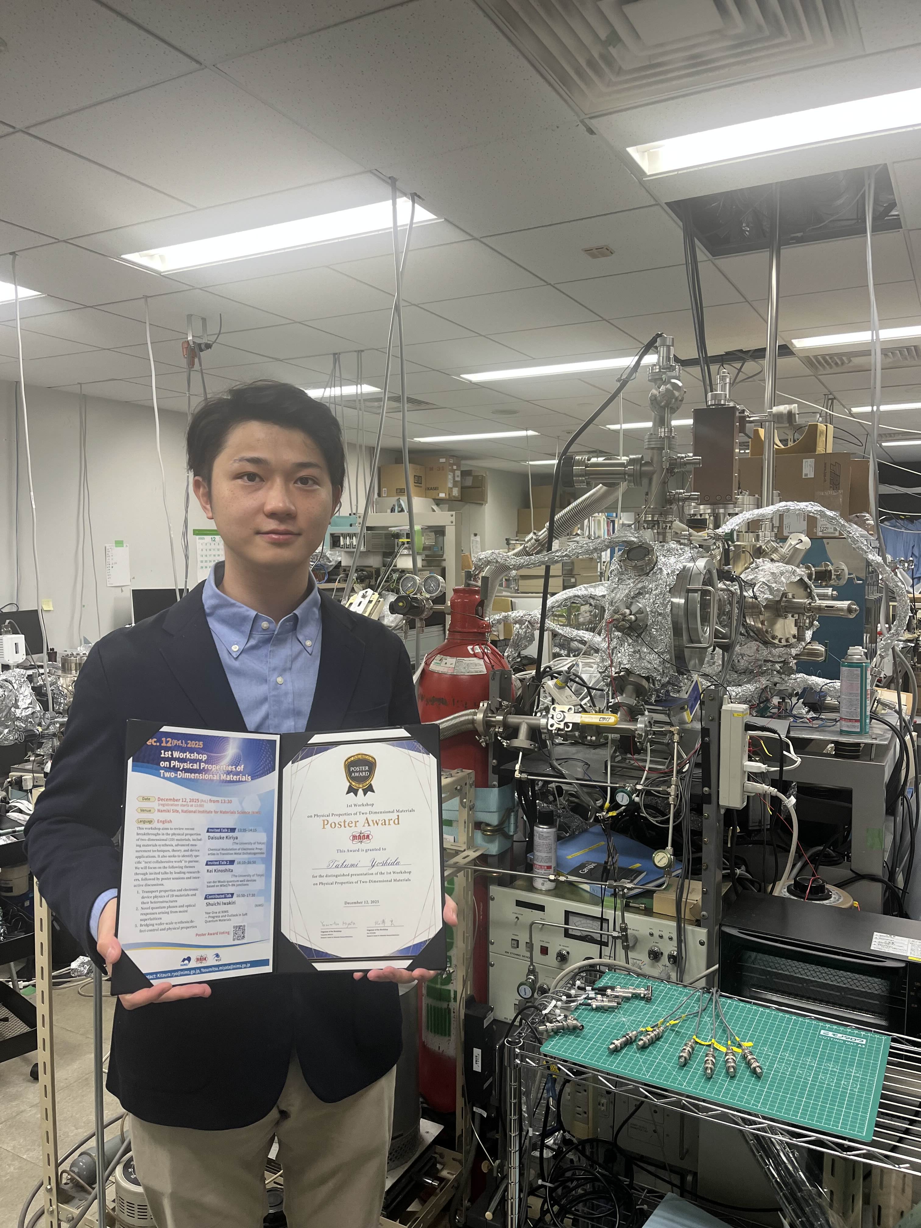 吉田君が1st Workshop on Physical Properties of Two-Dimensional MaterialsでPoster Awardを受賞されました.おめでとうございます.